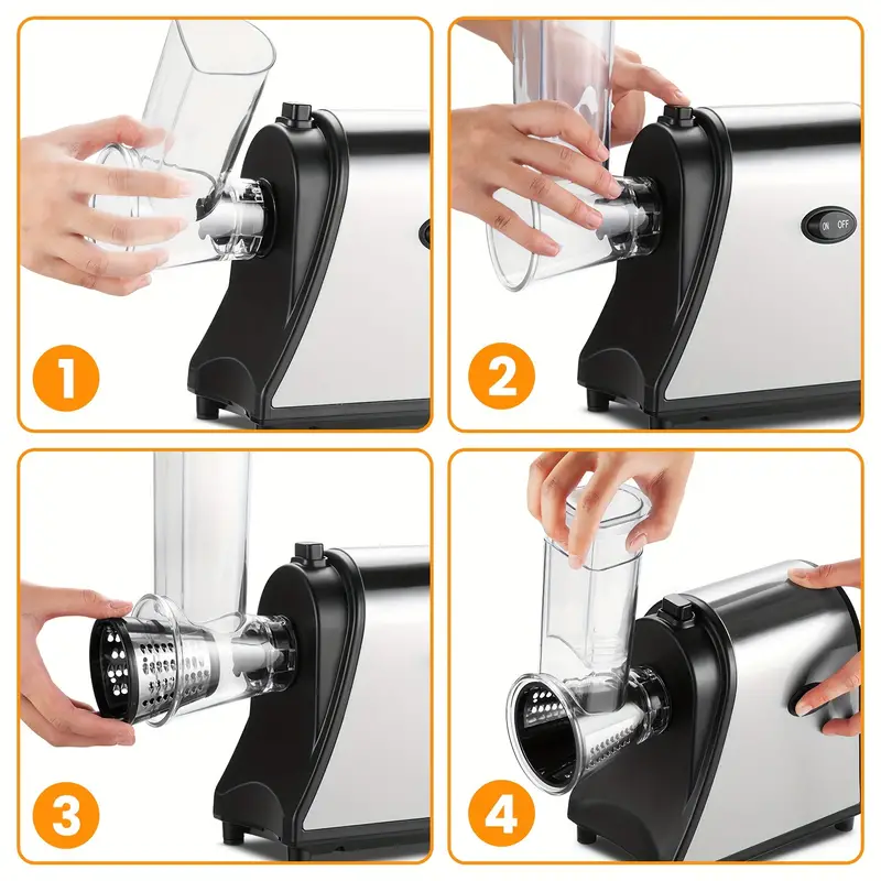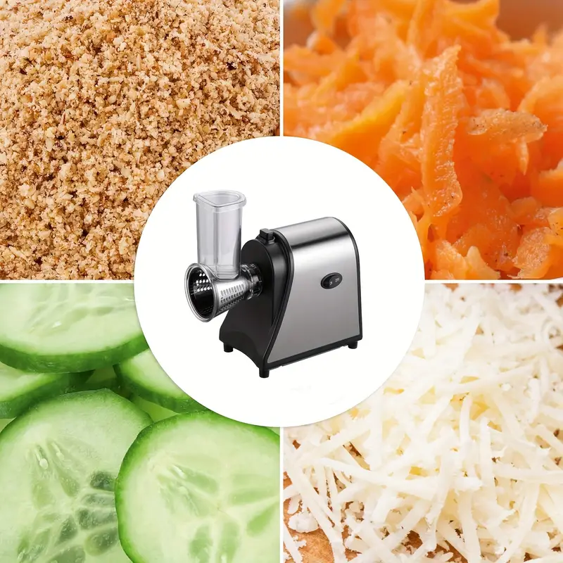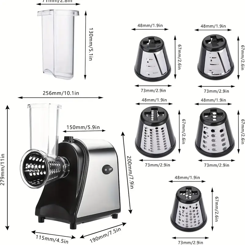 Package includes: 1 x Electric Vegetable Slicer 2 x Cutting Insert 1 x Fine Grating Insert 1 x Coarse Grating Insert 1 x Ground Blades 1 x User Manual