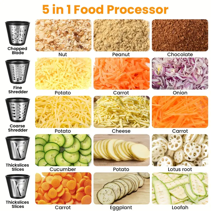 Easy to Store and Clean: The lightweight design of the chopper fits on any kitchen counter. The blades and the feed tube are removable. Very easy to clean after disassembly. Ideal for processing potatoes, cucumbers, carrots, greens, fruits, smoothies, and more. You can also grind the ingredients into powder and process ice cubes into smoothies. With this, you no longer have to worry about injuring yourself with a knife while cooking!