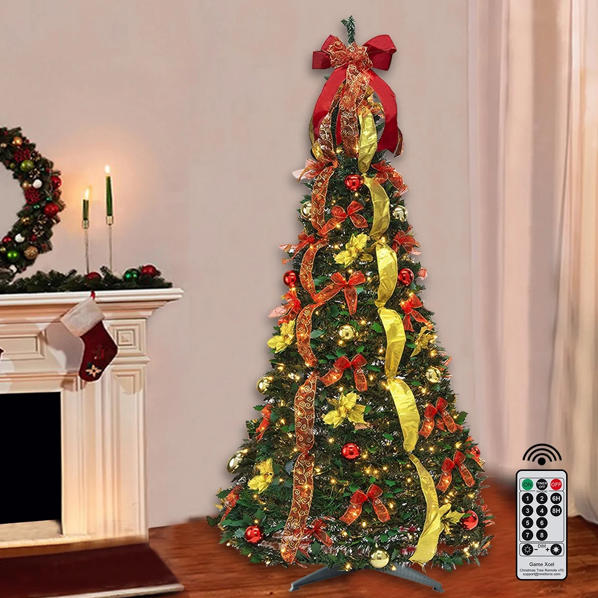 CHRISTMAS TREE INCLUDES: Red and gold ribbon+poinsettias+red and gold ornaments topped+big red bow. Lights are safe and listed for Indoor and Outdoor Use.