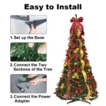 EASY TO ASSEMBLE: Christmas tree was designed to easily transform your home into a Christmas wonderland. Simply take the pop up Christmas out of the box, place it in the sturdy stand, pull it up, and plug it in. Decorations are permanently attached to collapse back down in minutes for easy storage.