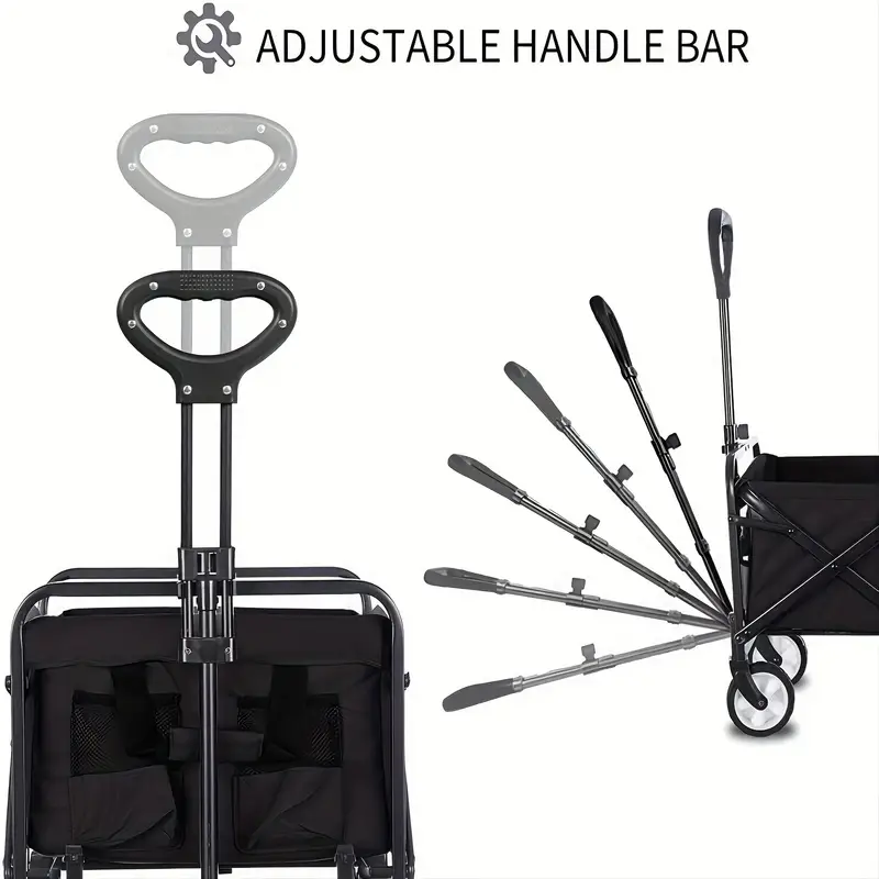 [Effortless Mobility With Adjustable Features]: Command Your Collapsible Wagon Effortlessly With 7-inch Rubber Tires And A 360° Rotating Front Wheel Design. The Front Two Wheels Feature Brakes For Swift Stops With Just A Tap Of Your Foot. Plus, An Adjustable Pull Rod Ensures Smooth And Comfortable Pulling. Parking Is A Breeze – Just Press The Middle Lock Button And Lower The Pull Rod