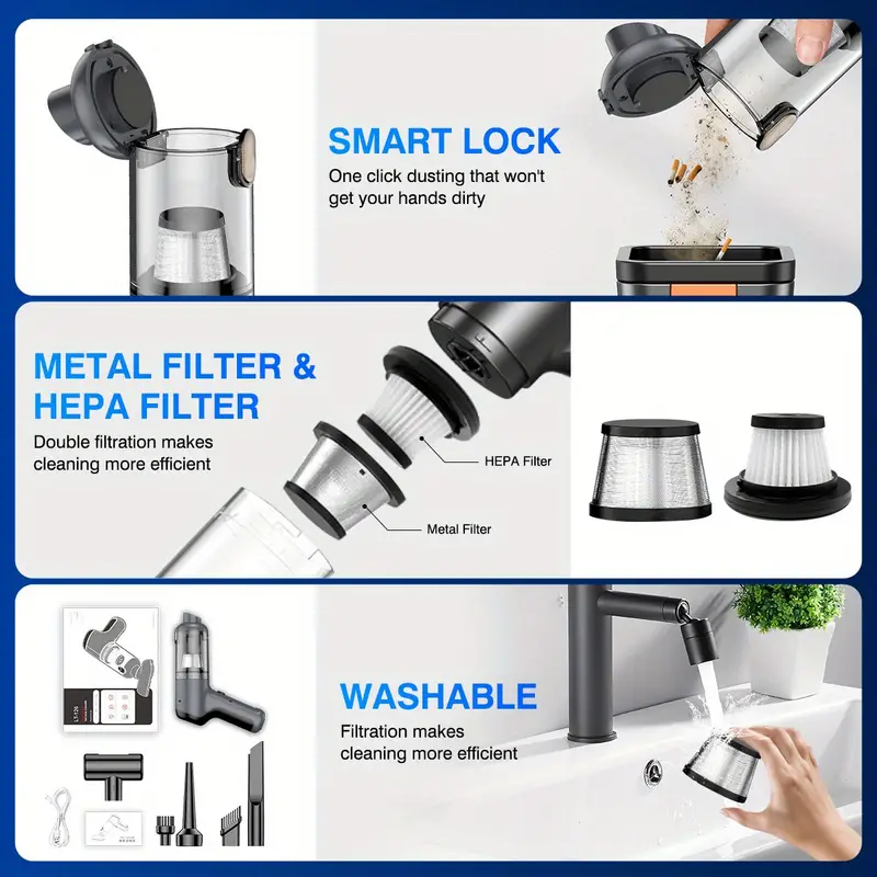 Multi-attachment deep cleaning: The handheld car vacuum cleaner is equipped with a variety of attachments to help you clean every nook and cranny of your vehicle. The small and slim nozzle is enough to reach between the car seats or under the seats for quick cleaning. All attachments can reach deep into every nook and cranny, leaving no place untouched. Therefore, you don’t have to go to the car wash every time you want to clean the inside of your car.