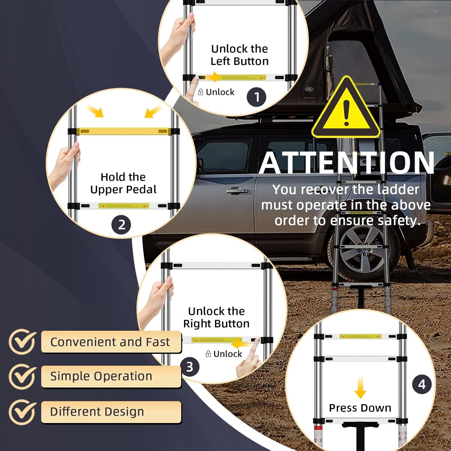 VEVOR telescoping ladder safety guide showing locked and unlocked steps to avoid pinching fingers.